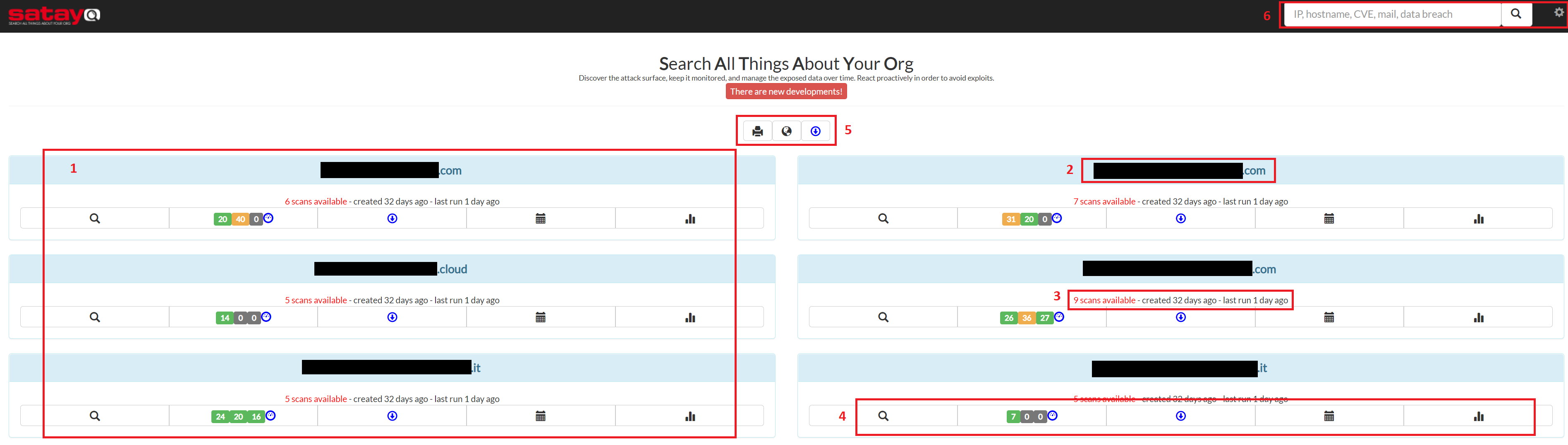 The button with the printer emoji lets you download a document called “Global Executive Summary”. Inside you will find a summary of the critical issues retrieved by SATAYO for all the domains that are being monitored. Details about the Exposure Assessment Index Value can be found within this document.