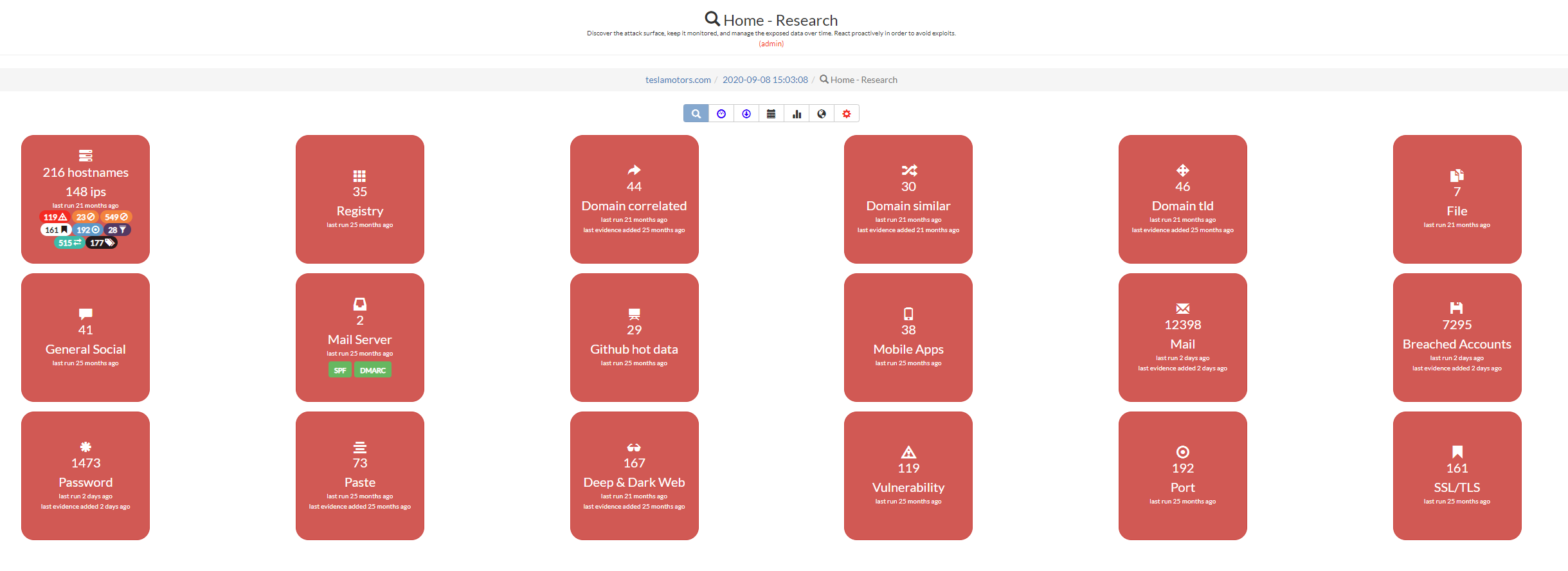 This page lists all the items collected by SATAYO, visible from the GUI. The collected elements can vary from organization to organization and it is possible that not all items are available for your search. This is not a bug, but the fact that SATAYO did not find anything related to your company in that specific category. You can use this page to get a better understanding of what a certain section does and to get an idea of your overall exposure by comparing the evidence found for your company with all the evidence analyzed. You can click on each item to explore it further.