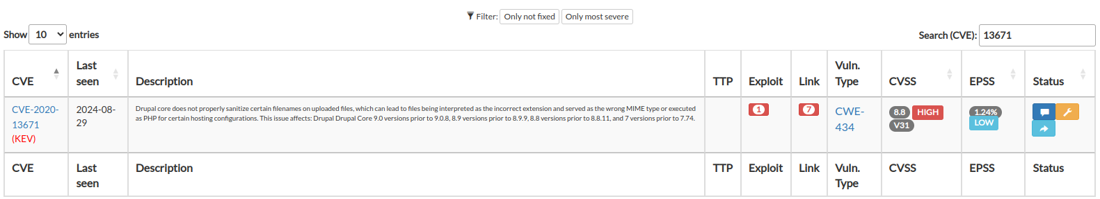 The EPSS value is also shown, which is a data-driven effort for estimating the likelihood (probability) that a software vulnerability will be exploited in the wild. The EPSS model produces a probability score between 0 and 1 (0 and 100%). The higher the score, the greater the probability that a vulnerability will be exploited. EPSS is managed by FIRST, and SATAYO is present in the official list of EPSS supported vendors.